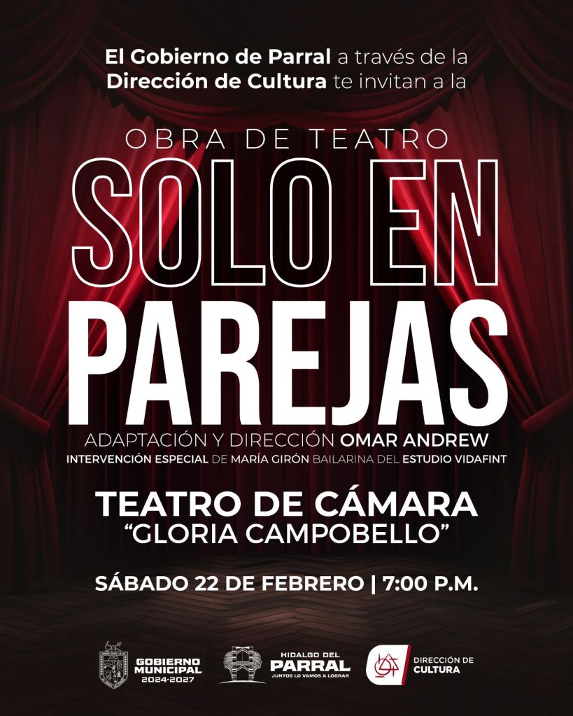 El Gobierno de Parral encabezado por Chava Calderón, a través de la Dirección de Cultura invita a la ciudadanía a la obra de teatro “Solo en Parejas” este sábado 22 de febrero en el emblemático Teatro de Cámara “Gloria Campobello” a las 19:00 horas en un evento totalmente gratuito.