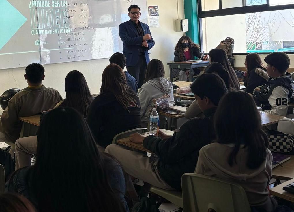 Promueve el director del Instituto Municipal de la Juventud (IMJUVE) pláticas sobre liderazgo y participación de las juventudes en el Colegio de Bachilleres plantel 12, como parte fundamental en la conformación de las políticas públicas.