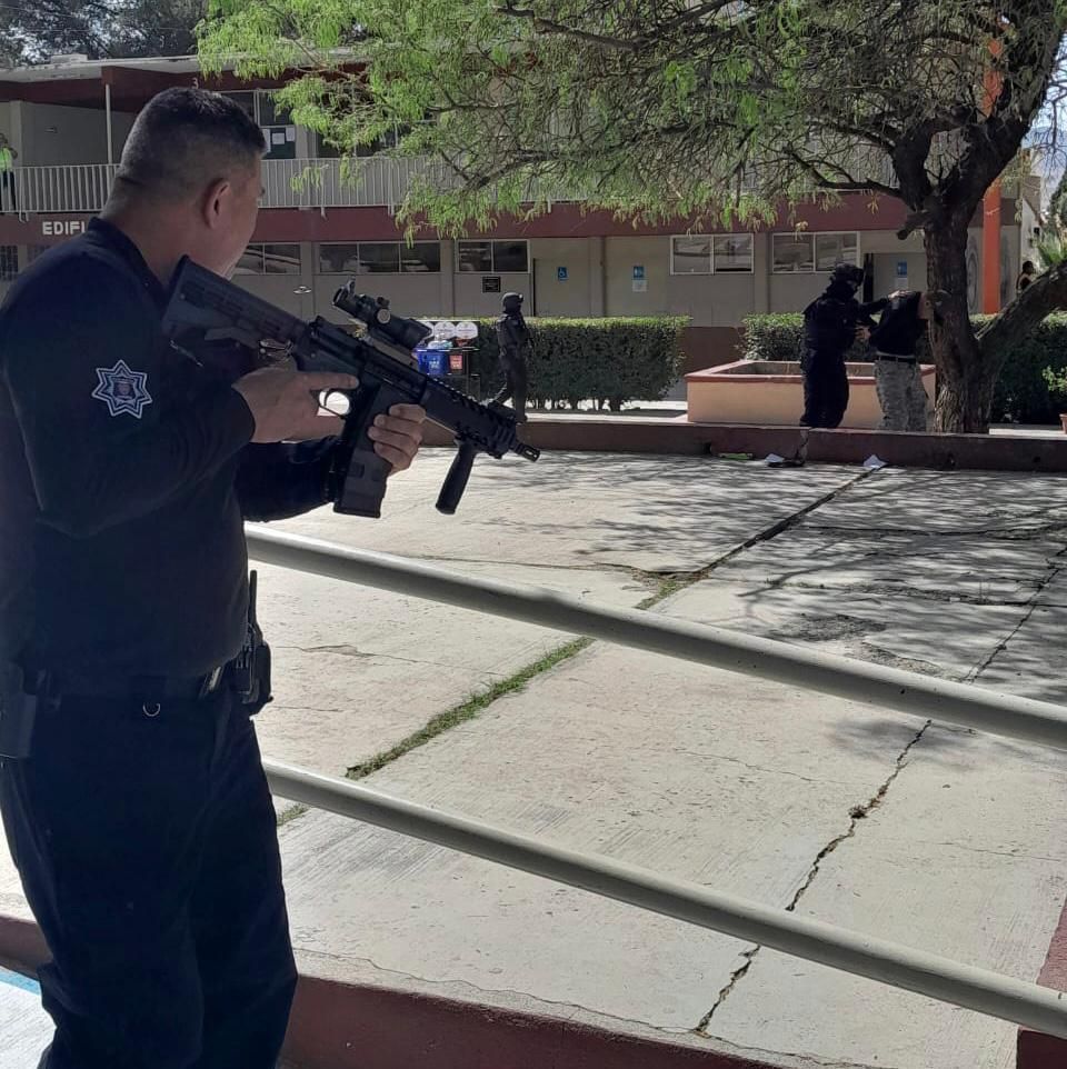 Como parte de los simulacros que se desarrollan de manera periódica el Gobierno de Parral, encabezado por Chava Calderón a través de la Dirección de Seguridad Pública Municipal realizó una intervención de portación o uso de armas en el CBTis 228 con el objetivo de brindar herramientas que les permita actuar en una situación de riesgo.
