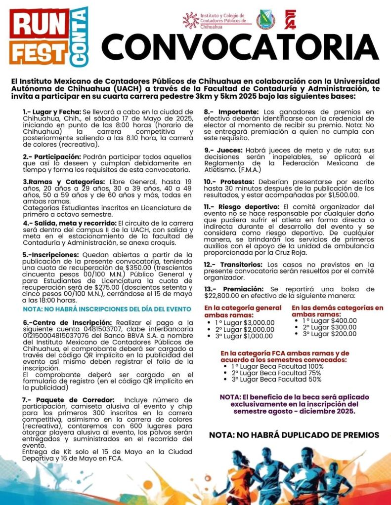 En el marco del Día del Contador, la Universidad Autónoma de Chihuahua, a través de la Facultad de Contaduría y Administración (FCA), en coordinación con el Instituto y Colegio de Contadores Públicos de Chihuahua, invitaron a la 4.ª. Carrera Run Conta Fest, a realizarse el 17 de mayo a las 8:00 horas en el circuito universitario del campus II.