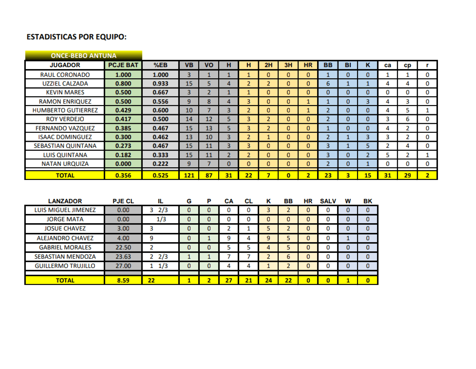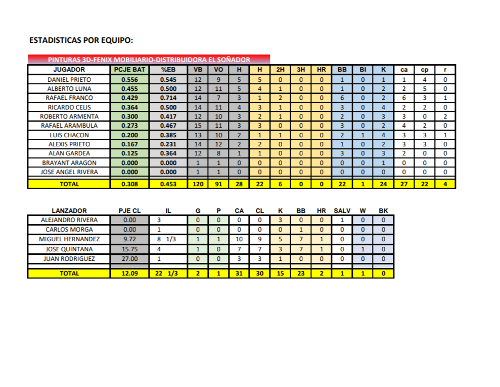 Estadísticas por equipos de la final en La Liga Regional de Beisbol.