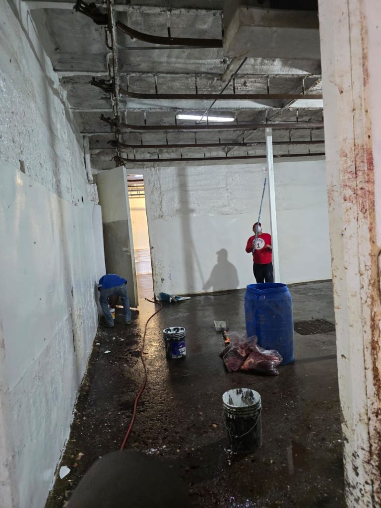 Las labores incluyeron la aplicación de pintura epóxica en los dos cuartos fríos, la habitación central y las áreas exteriores de concreto, lo cual no solo mejora la imagen del espacio, sino también su resistencia a factores de uso constante. Asimismo, se sustituyeron azulejos dañados y se aplicó boquilla, lo que contribuye a mantener condiciones sanitarias óptimas en las áreas de trabajo.