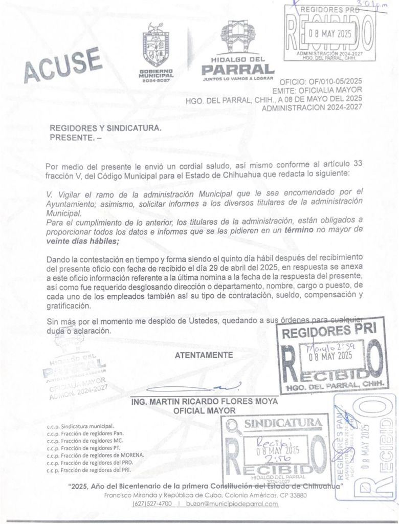 En un ejercicio de transparencia y legalidad, el Gobierno de Hidalgo del Parral, encabezado por el alcalde Salvador Calderón, dio respuesta oportuna a la solicitud formal presentada por regidores y la sindicatura municipal, entregando la información correspondiente a la nómina del personal que labora en la administración pública.