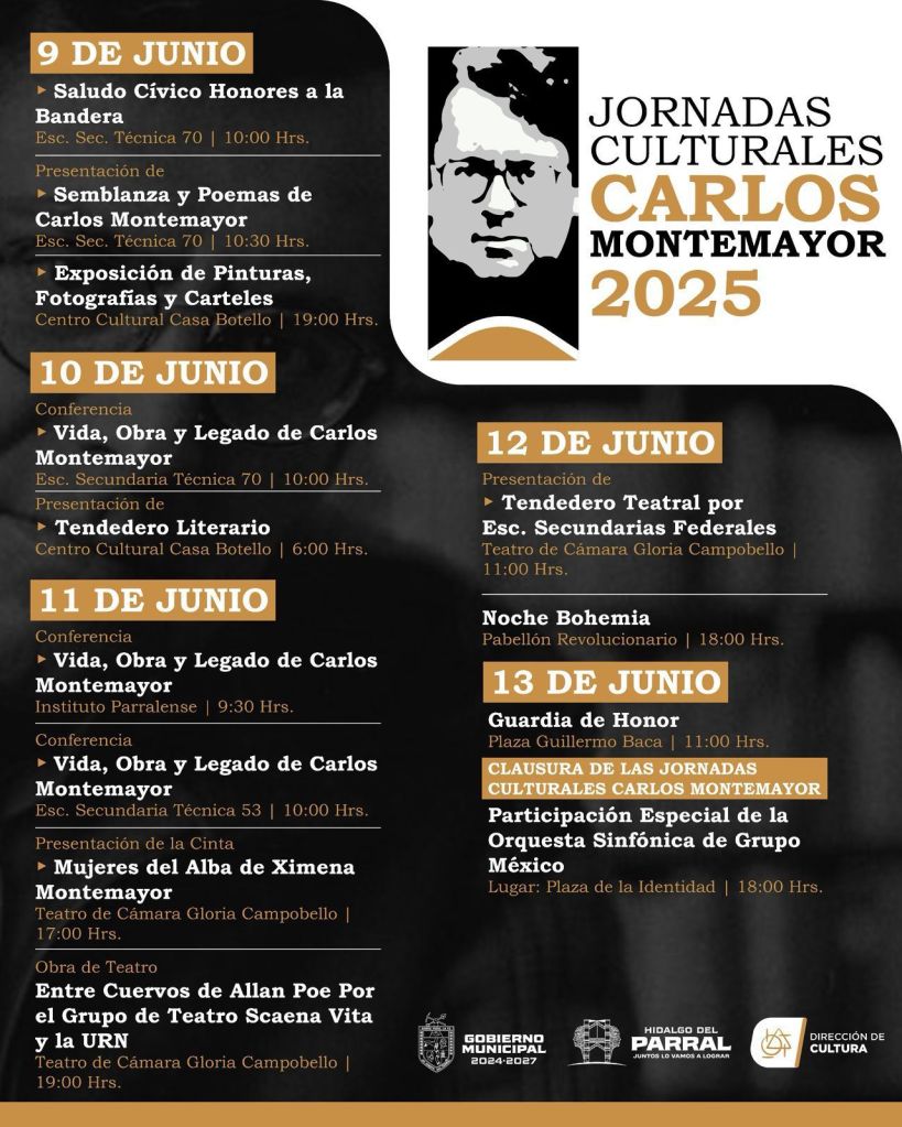 El Gobierno Municipal de Parral, encabezado por el alcalde Salvador Calderón, anunció la realización de las Jornadas Culturales Carlos Montemayor 2025, una celebración que rinde homenaje al escritor parralense y su valiosa contribución a la literatura mexicana.