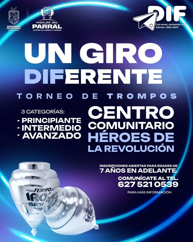 El Ayuntamiento de Hidalgo del Parral, a través del Sistema para el Desarrollo Integral de la Familia (DIF Municipal), invita a niñas, niños y jóvenes a participar en el Torneo de Trompos “Un Giro DIFerente”, el cual se realizará el próximo viernes 4 de julio a las 5:30 de la tarde en el Centro Comunitario Héroes de la Revolución.