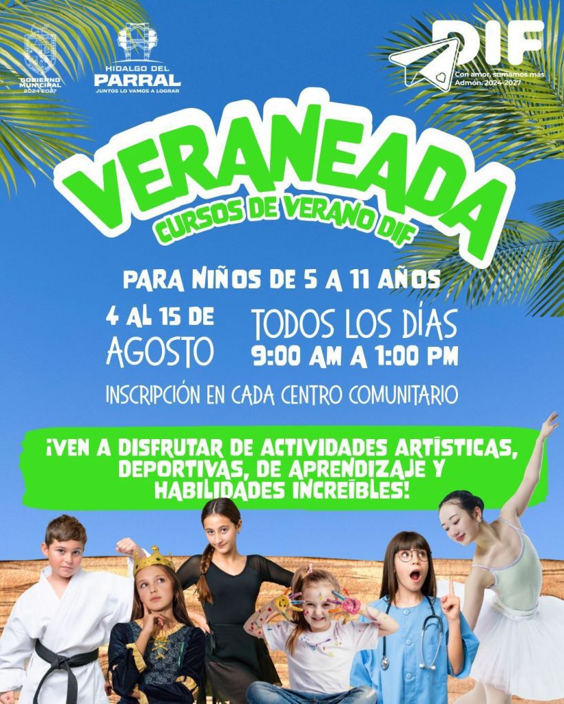 El Gobierno de Parral, a través del DIF Municipal, convoca a madres, padres y tutores a inscribir a sus hijas e hijos en la Veraneada 2025, que se llevará a cabo del 4 al 15 de agosto, con un horario de atención de 9:00 de la mañana a 1:00 de la tarde, de lunes a viernes.