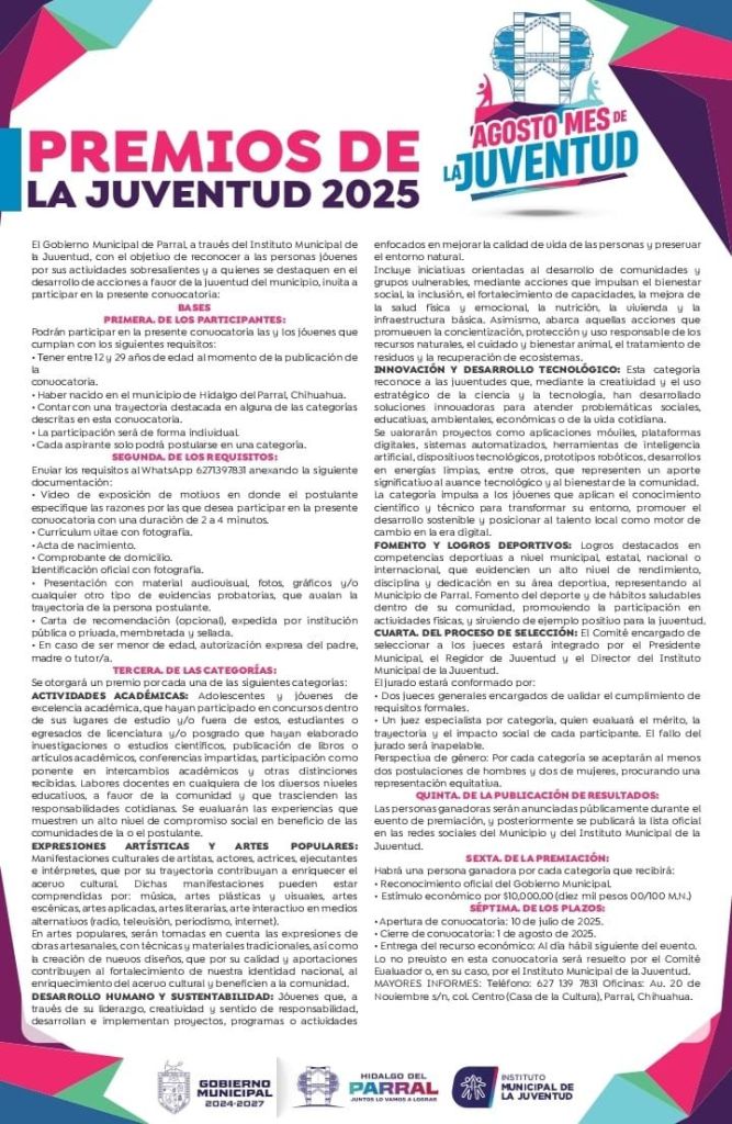 El Gobierno de Parral, a través del Instituto Municipal de la Juventud (IMJUVE), abrió oficialmente la convocatoria para los Premios de la Juventud 2025, un galardón que busca destacar la labor de jóvenes con iniciativas, talentos y trayectorias ejemplares en distintos ámbitos de desarrollo personal y social.