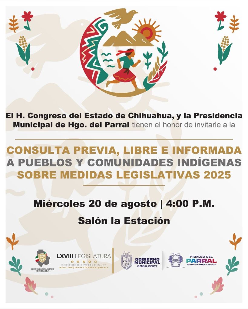 El Gobierno de Parral, en coordinación con el Honorable Congreso del Estado de Chihuahua, convoca a la Consulta Previa, Libre e Informada a Pueblos y Comunidades Indígenas sobre Medidas Legislativas 2025, un ejercicio de participación que busca garantizar que las voces de los pueblos originarios y comunidades indígenas del Estado de Chihuahua sean escuchadas, respetadas e incorporadas en el proceso legislativo.