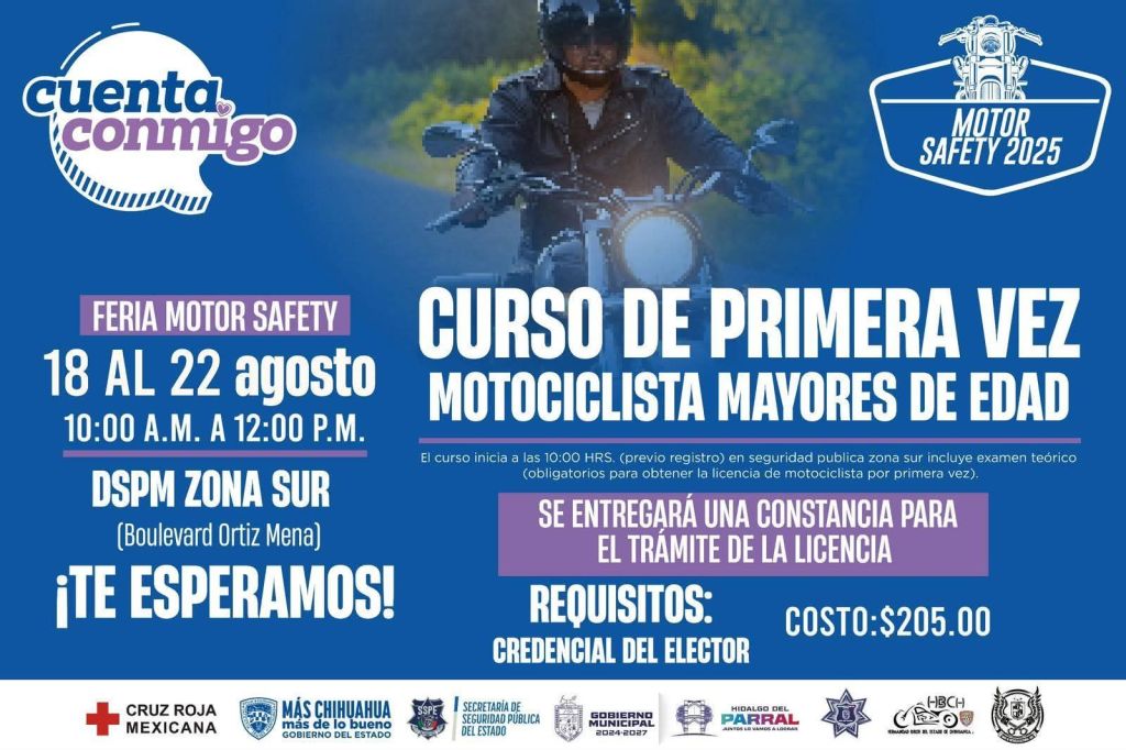 El Gobierno de Parral, a través de la Dirección de Seguridad Pública Municipal (DSPM), invita a la ciudadanía a participar en el curso para tramitar por primera vez la licencia de conducir para motociclistas, el cual se llevará a cabo del 18 al 22 de agosto.