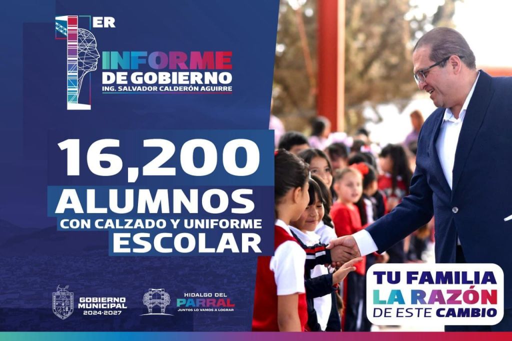 En su primer año de gobierno, el alcalde Salvador Calderón reafirmó su compromiso con la educación al beneficiar a más de 16,200 alumnos de 110 escuelas con la entrega de uniformes y calzado escolar, asegurando que niñas, niños y jóvenes de Parral cuenten con los recursos necesarios para su formación académica.