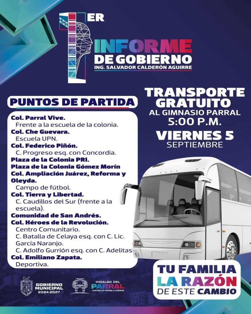 Las salidas están programadas a las 5:00 de la tarde con destino al Gimnasio Parral, sede oficial del informe, donde se presentarán los logros alcanzados durante el primer año de la administración 2024–2027.